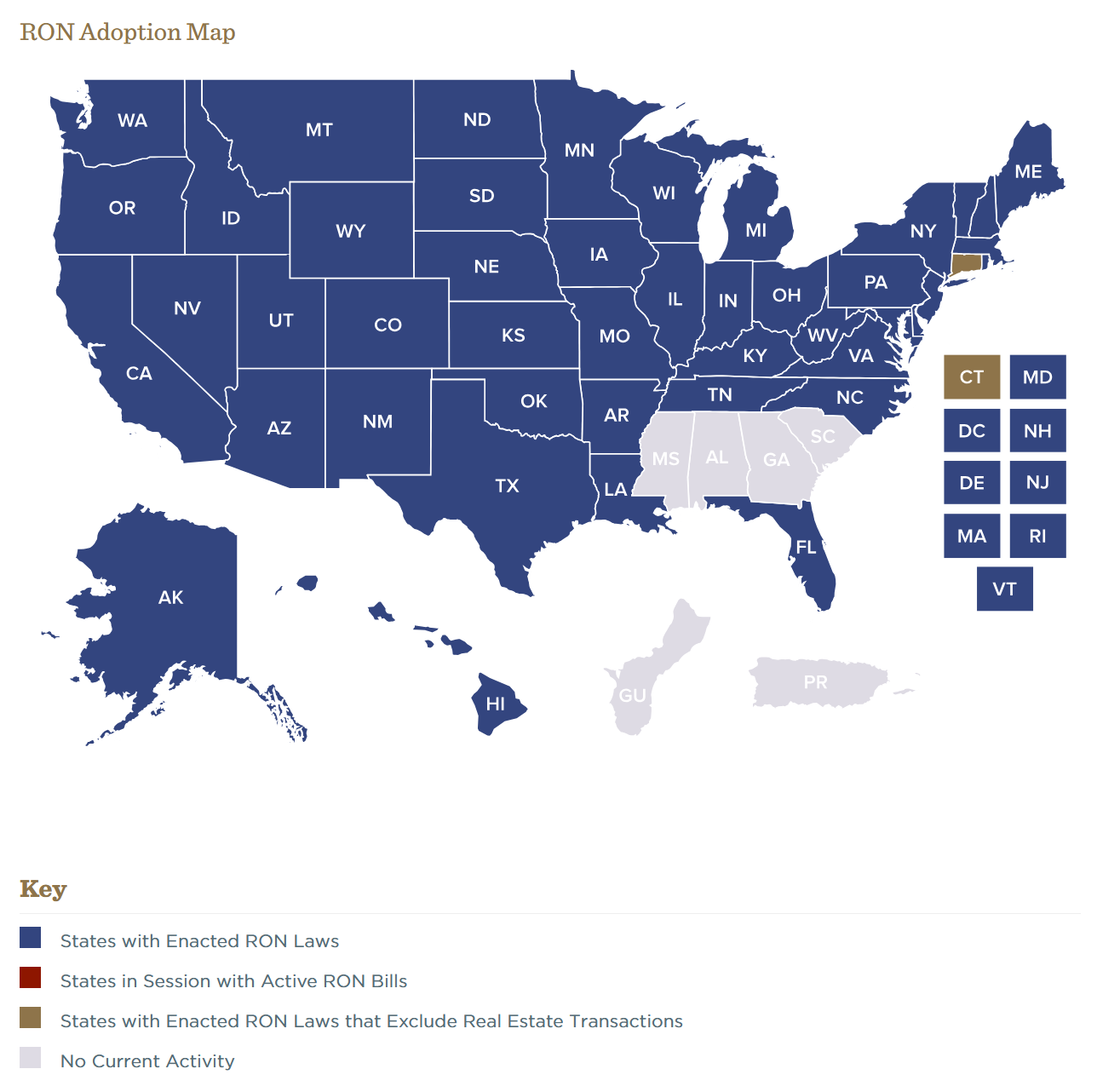 Remote Online Notarization, or RON, is the use of audio/visual technology to complete a notarial act when the principal is not in the same physical location as the notary public. Getting consistent state laws passed in all 50 states, DC and Puerto Rico is a critical step in moving to a fully digital mortgage experience. That is why MBA partnered during 2017 with the American Land Title Association to begin a campaign to create a model bill for introduction and passage in every legislature. That campaign has been very successful, and MBA is proud to point out that: